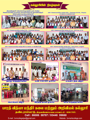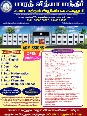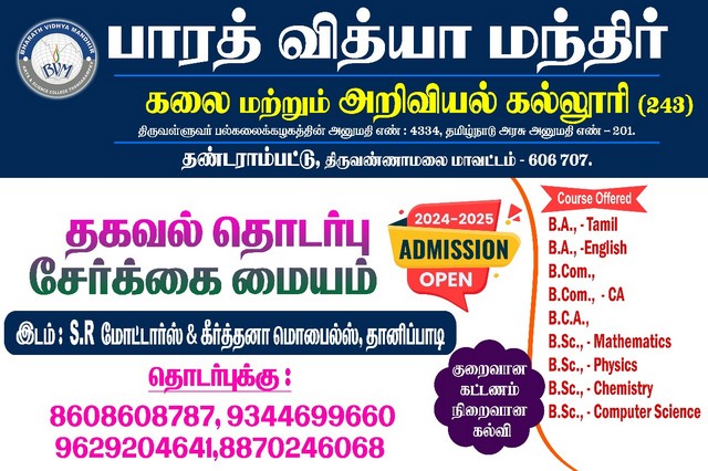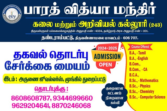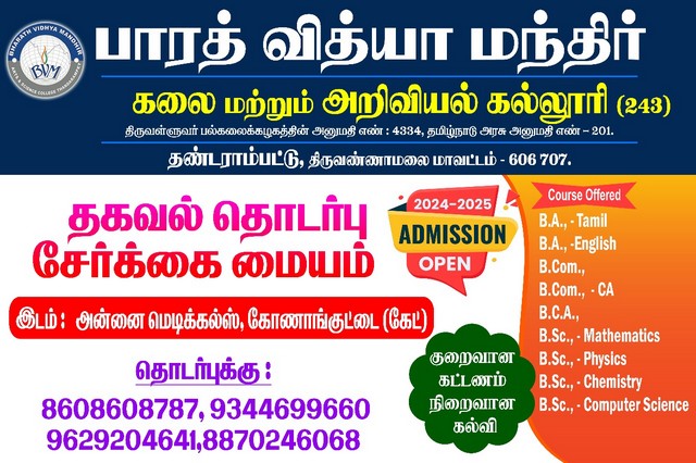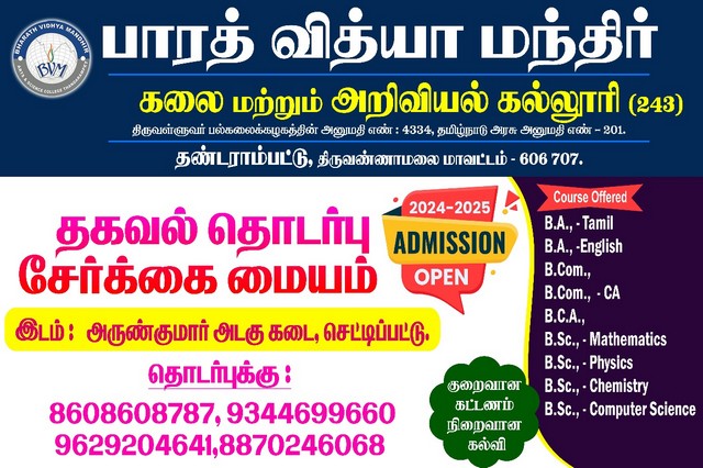 Bharath Vidhya Mandhir Arts and Science college, Kilravanthavadi, Thandrampet is an affiliated self financing college of the Thiruvalluvar University, Vellore. It was established in 2016.